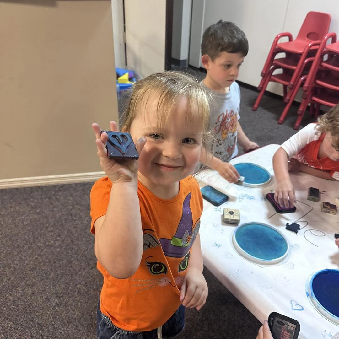Our ratio for these little learning sponges is one teacher to five children, maximum of 10 children to two teachers. All two-year-olds attend music, movement, and Bible classes each week.